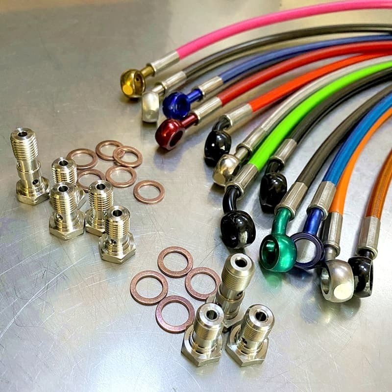 Avec 30 couleurs disponibles de notre revêtement PVC soit la plus grande gamme aujourd'hui en Europe, nous réalisons de multiples combinaisons de durites aviation et banjos inox pour le tuning, la compétition et pour votre sécurité. Nos kits de durites en tresse métallique et revêtement PVC sont aussi réalisées pour des motos équipées d'ABS.