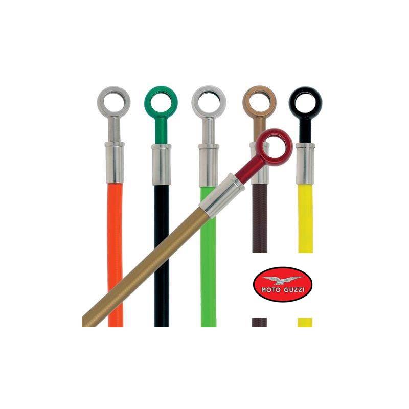 Braided brake line kit of your Moto Guzzi V50 Monza MK III are manufactured and assembled by the EZDRAULIX partner from the last 15 years. Today more than 1,5 Million meters a year are produced by this factory, asserting they are produced as per the highest standards. Our wide range of more than 30 colors of PVC cover, makes us the N°1 in Europe for the variety of colors. We make loads of Brake lines & banjos combinations for tuning, racing and for your safety. Our PVC covered stainless steel brake line kits can also be made for motorcycles with ABS.
